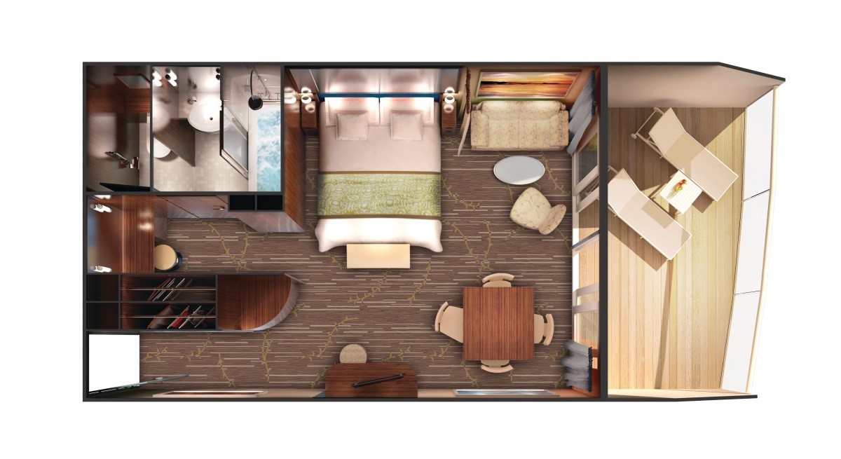开放式的阁楼套房设有朝向前部的大型阳台。设有1张大床,带有浴缸的豪华卫生间。起居区域配有餐桌。沙发可开启供额外的游客使用。享受管家和礼宾服务。